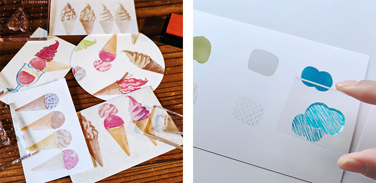 繰り返し貼ってはがせる透明なフォトポリマー製のクリアスタンプは、思い通りの位置へスタンプ捺すことができます。
