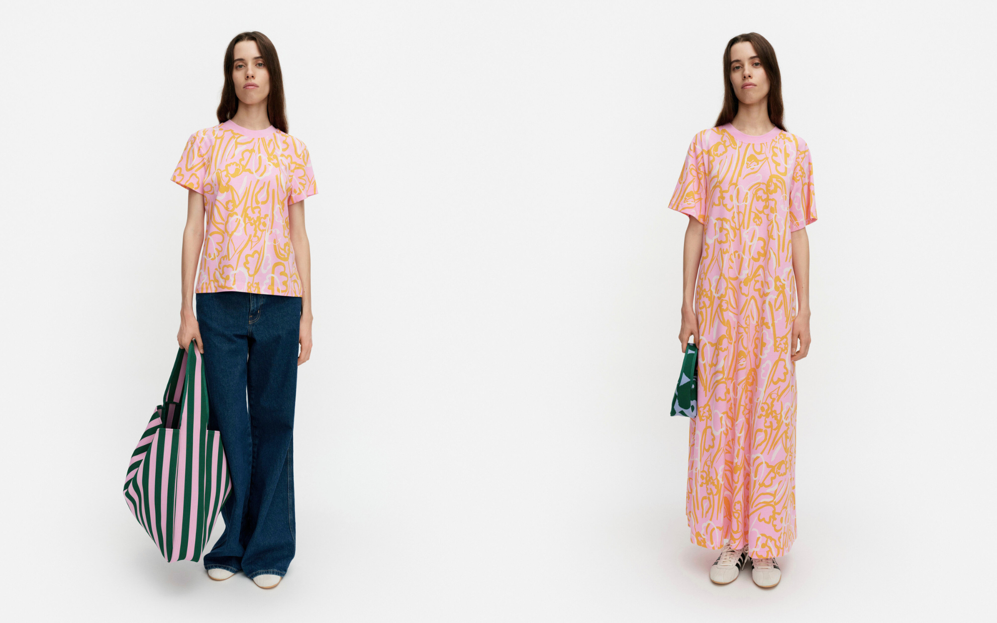 ピンクをベースに、オレンジのラインで描かれた総柄デザインが印象的なTシャツとドレス。軽やかでやさしい着心地に仕上げました。