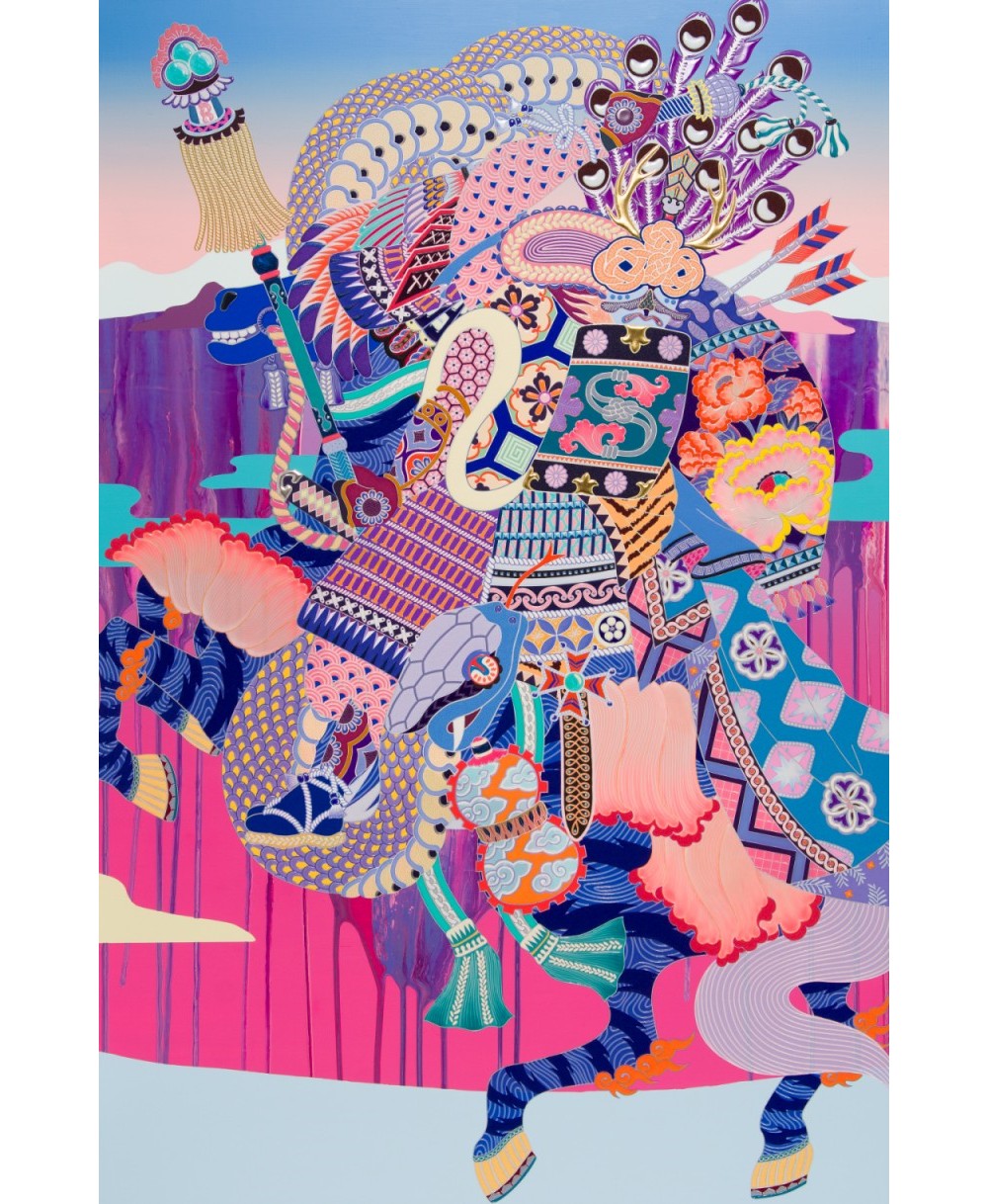 京森は、装飾やシンボルを通して人間の欲望や権威の構造を描き出す作品で注目を集めています。宗教美術や歴史的な装飾文化から着想を得ながら、鮮やかな色彩と緻密な構成、そして独自の素材表現を組み合わせることで、強い視覚的インパクトを持つ作品を制作しています。また、エルメス主催のアートアワードでの受賞をはじめ、その独創的な表現は国内外で高く評価されています。