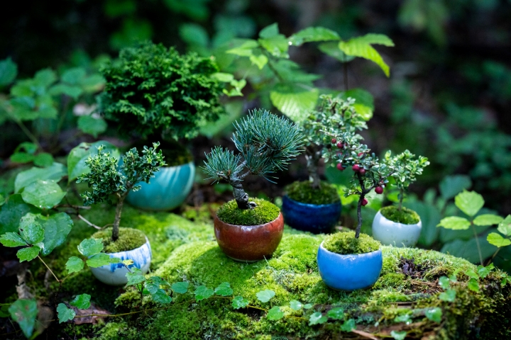 さまざまなカラーの鉢と受け皿、そして個性豊かな樹木の中からお好きなものをお選びいただき、自分だけのオリジナル盆栽を制作するワークショップです。季節感を感じる樹木を中心にご用意しています。