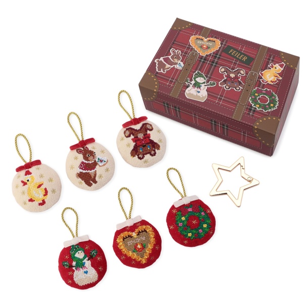 無地のシュニールに可愛らしいモチーフを刺繍したオーナメントのセット。付属の星形のカラビナを使ってバッグチャームのようにもお使いいただけます。タータンチェックのトランクデザインのボックスに納まります。