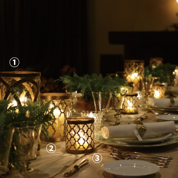 ①リングが重なるシンプルなデザインが人気。 ③ゴールドのアラベスク模様が異国情緒あふれるランタン。炎のゆらぎが食卓を豊かに彩ります。炎を灯すキャンドルの他フェイクキャンドルでもお楽しみいただけます。