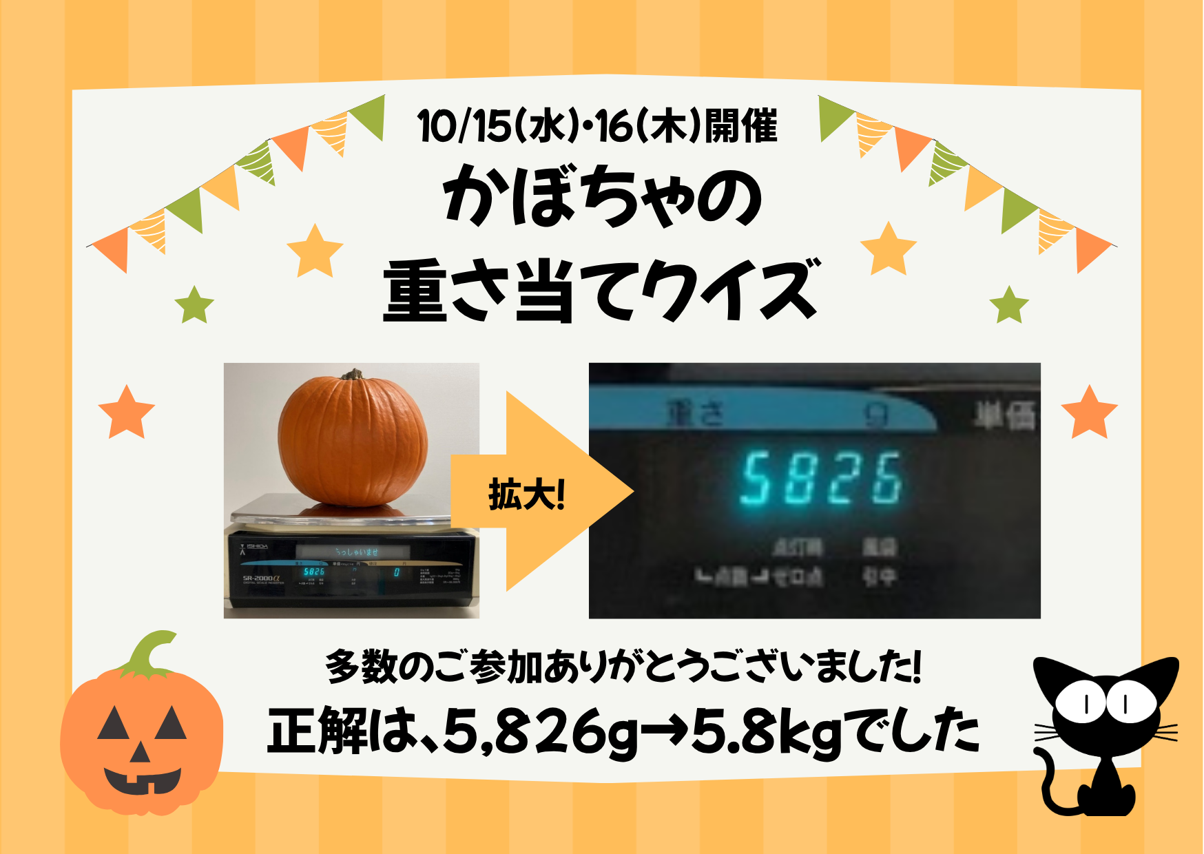 10月15日(水)・16日(木)開催の「かぼちゃの重さ当てクイズ」結果発表