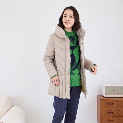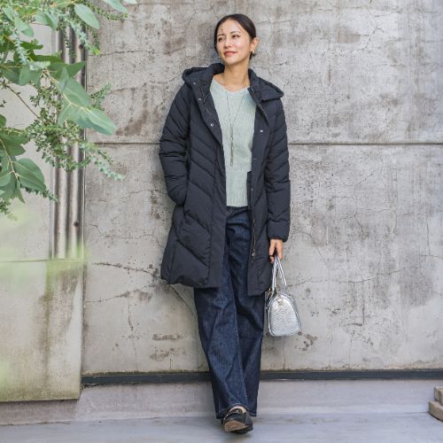 斜めに入れたステッチと程よくシェイプしたウエストラインがスリムに見せてくれるダウンコートで、ダウン分量を少なくしボリュームが出過ぎないようにスッキリ見せてくれます。