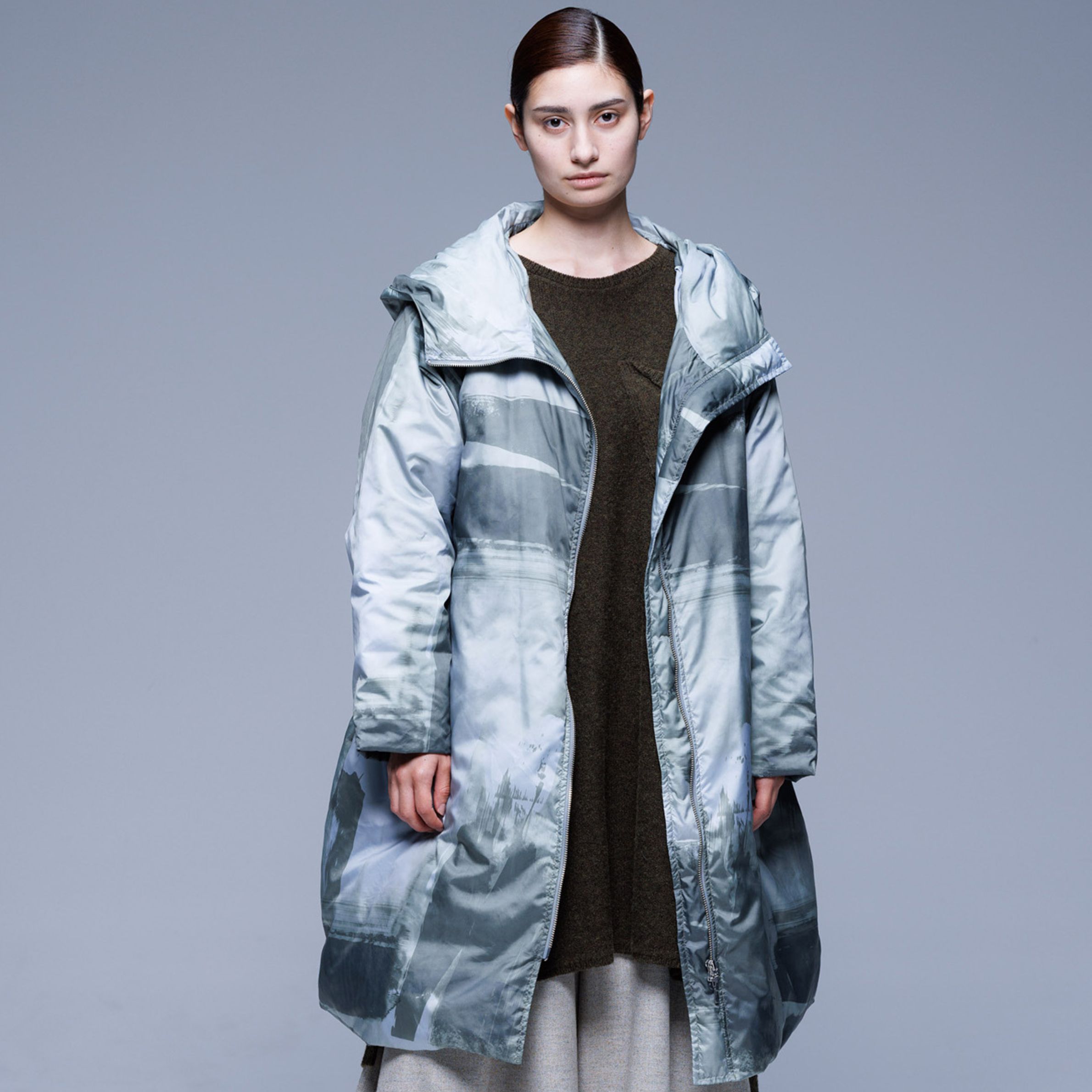手描き風柄がアーティスティック。高密度で保温性が抜群のダウンコートです。