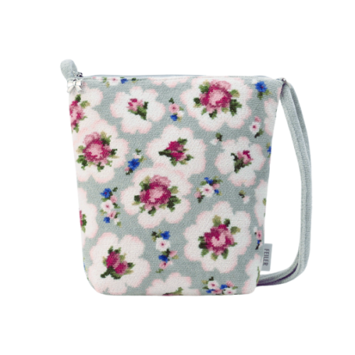 バラや小花のブーケをちりばめた彩り豊かなデザイン。身体に沿いやすい薄型のショルダーバッグで、長財布が縦にスッと入ります。