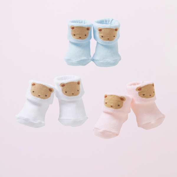 クマちゃんアートがキュートなカップソックス。コーディネートしやすいホワイト、ペールトーンのブルー・ピンクの3色ございます。※ソックス底滑り止めあり