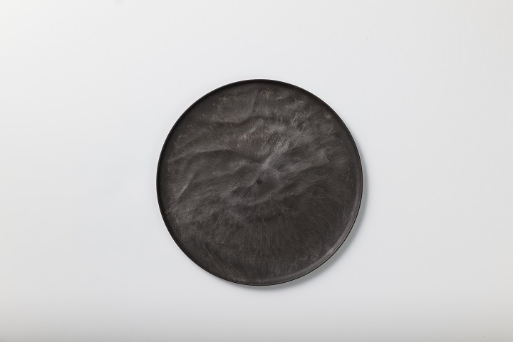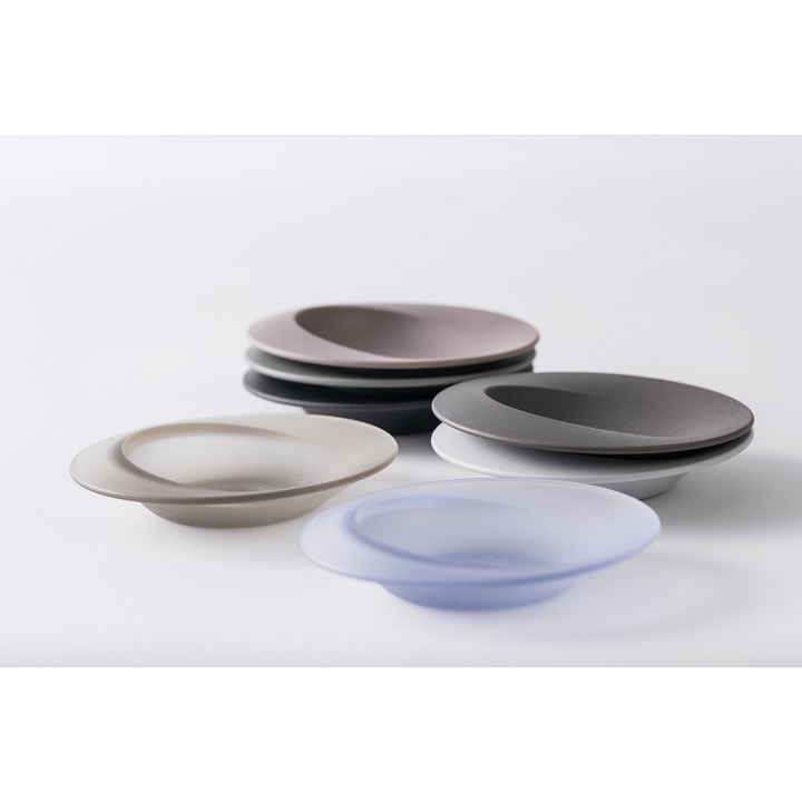 杉皮原料を使用し、環境と共生するサステナブルコレクション。表面の波模様が特徴で、ソースやドレッシングをかけてもお皿全体に流れません。波模様部分に焼いたパンを置くと蒸れず、フラット部には小鉢を置いていただける、デザイン性と機能を兼ね備えた器です。