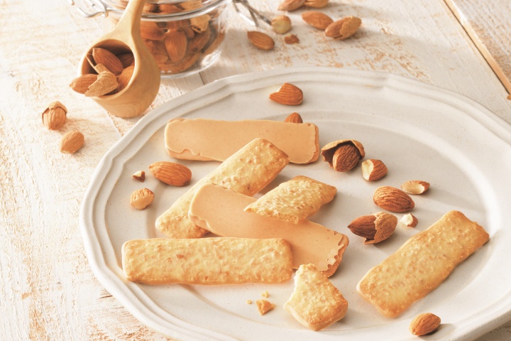 アーモンドを練り込んだクッキーの片面に、アーモンド風味のチョコレートをコーティング。