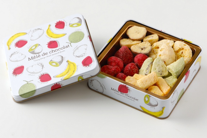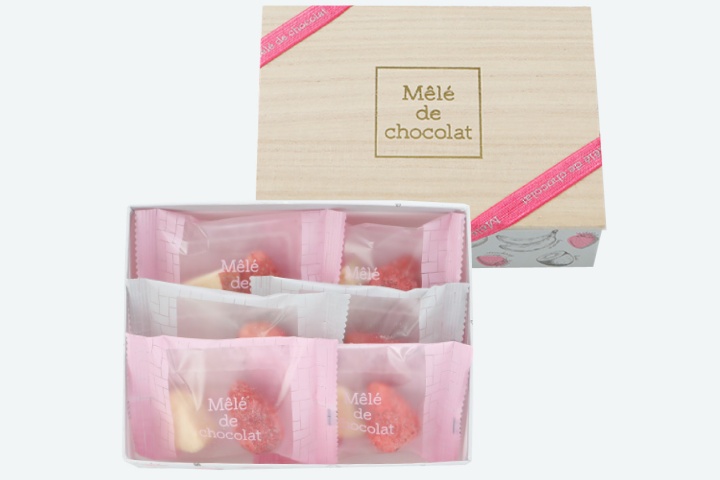 「メレ・ド・ショコラ」で1番人気のストロベリーと3種のフルーツをペアにした"しみこみショコラ"包装のセットです。