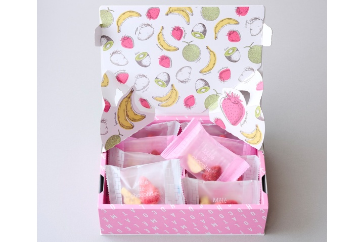 ストロベリー、バナナ、メロン、キウイ、マンダリンのしみこみショコラ5種をお楽しみください。
