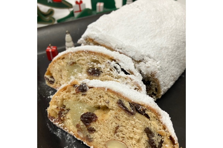 グラスフェッドバターと、2種類のリキュールに漬け込んだフルーツ(レーズン、オレンジピール、チェリー、ドライアップル、ドライパイン)を使用し、風味豊かでリッチなシュトレンに仕上げました。