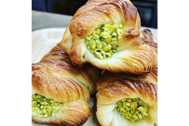 デニッシュ生地のコルネにピスタチオクリームを入れ、ピスタチオをトッピングしました。