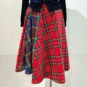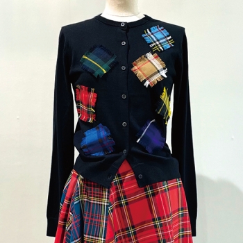 タータン ファブリックを何種類も使用してパッチワークに仕立てたスカートと、遊び心のあるカーディガン。