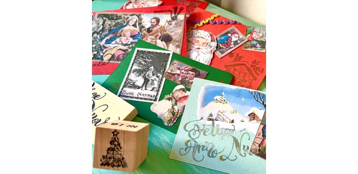 アンティークカードやイタリア語のスタンプをコラージュして、クリスマスカードやニューイヤーカードをお作りいただけます。