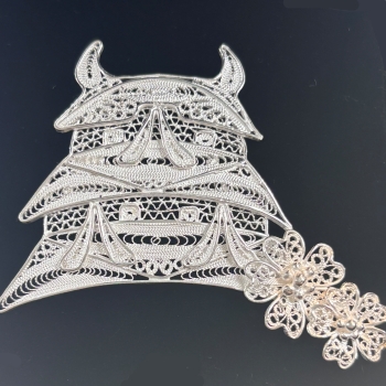 王族に献上するために技術を発展させたインドネシアの工房で作られる作品は、純銀を溶かすところから始まり、糸のように細くした銀をレースのように編んだ一点ものです。