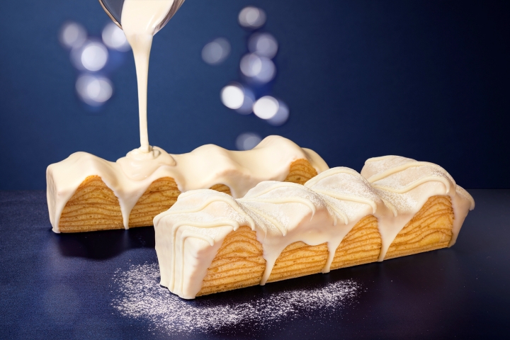バター風味たっぷりの「ねんりん家」の代表作"マウントバーム しっかり芽"に、とろりとかけたホワイトショコラの雪景色。