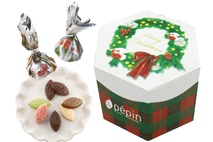 クリスマス限定のパッケージの中にはスカーレット(クランベリー、ピスタチオ、ミルク)とブラウン(アーモンド、モカ、ミルク)の巾着が3個ずつ入っています。