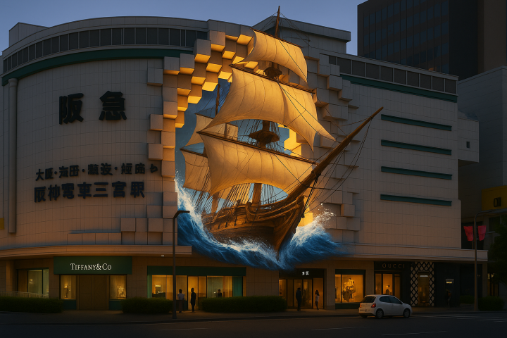 神戸阪急の壁面から開国当初の神戸の沖合に浮かぶ帆船・蒸気船の内、一隻の帆船が猛然と動き始め、ポータルの隙間から飛び出します。