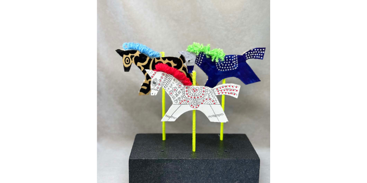 最後に糸を巻きつけた木の棒に取り付けて、メリーゴーランドの木馬を作ります。
