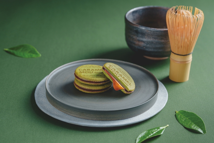 深い抹茶の香りが心地よいクッキー生地に、チョコレートでコーティングした、とろけるキャラメルソースをサンドしました。