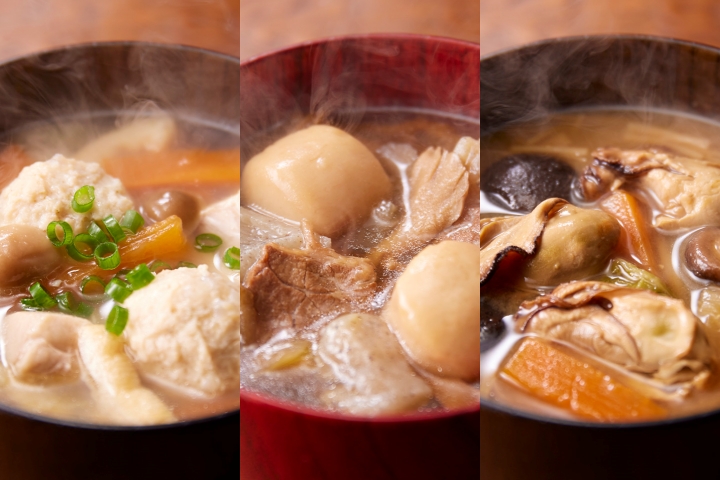 広島のかき鍋をお手本に、塩こうじをと魚粉を隠し味に使った、コクのあるみ具だくさんのみそ味のスープ。