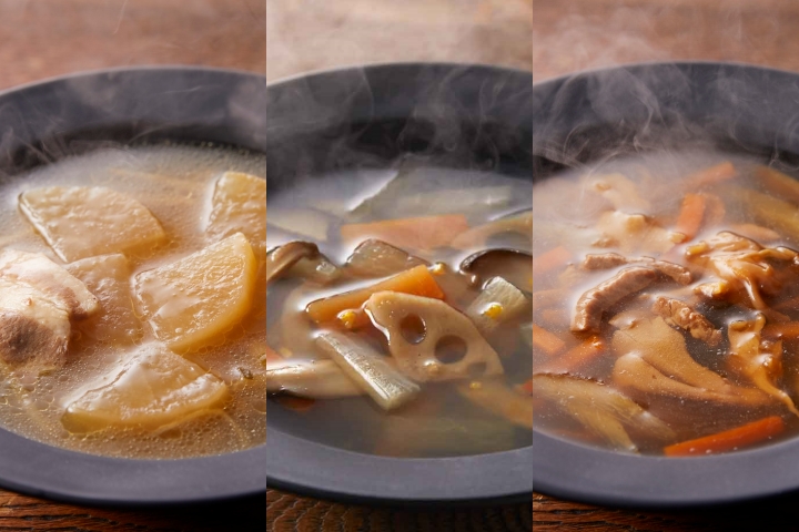 こんぶとかつおのおだしにゆずが上品に香るスープで、にんじん、だいこん、しいたけ、れんこんを煮込みました。