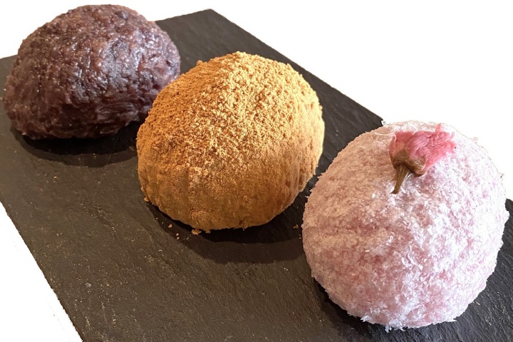 十勝産小豆を使用した粒おはぎ、深煎りきな粉を使用した黄粉おはぎ、こしあんに桜葉を刻んで入れた桜おはぎ。