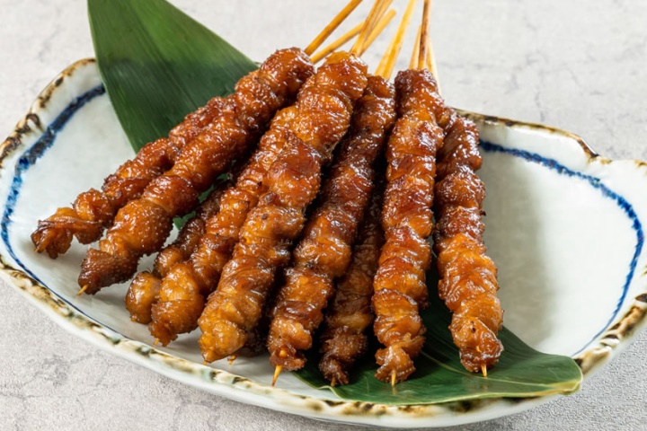 3羽で1本分しかとれない皮下脂肪の少ない首の皮だけを使用。