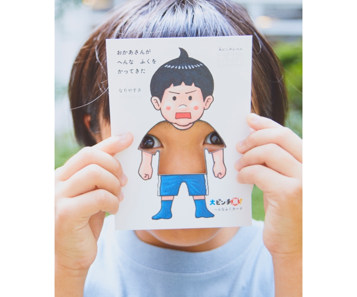男の子にへんなふくを着せることができるカードに、ポストカードが1枚ついています。展覧会の人気コンテンツ「大ピンチへんなふく」をお持ち帰り。