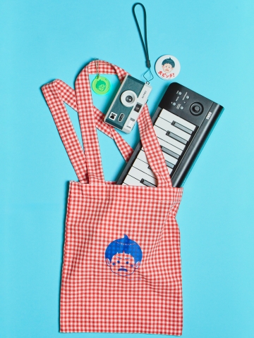 男の子の顔と「!!」があしらわれたバッグ。肩掛けできる長さの持ち手で、A4サイズが入ります。