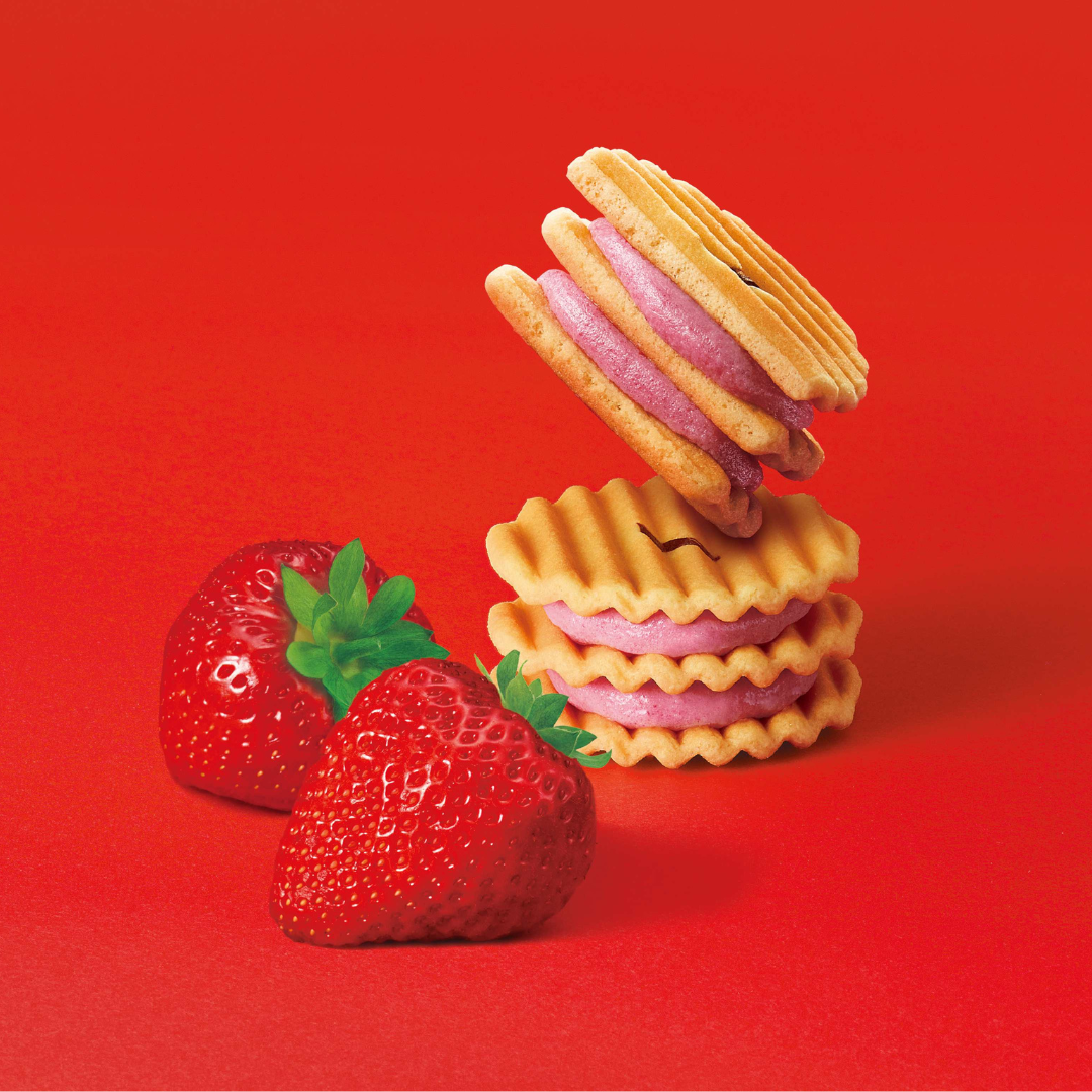 福岡県産あまおういちごのパウダーを使用し、しっとり焼き上げました。いちごの甘酸っぱい味わいの下層と、香り豊かな上層の2層のハーモニをお楽しみください。