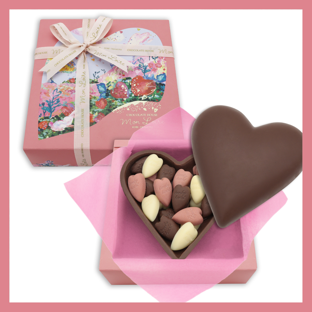 3色の小さなハートの粒チョコが大きなミルクチョコのハートの中に詰まっています。