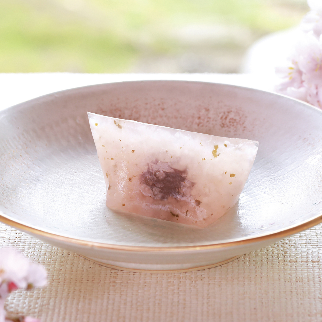 薄紅色に染めた白小豆餡を道明寺で包み、桜の花を添えました。