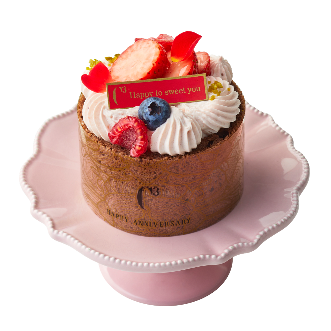 プラリネショコラムースにティラミスクリームを重ね、アクセントに甘酸っぱいベリージュレを忍ばせました。花束のような華やかなデザインです。