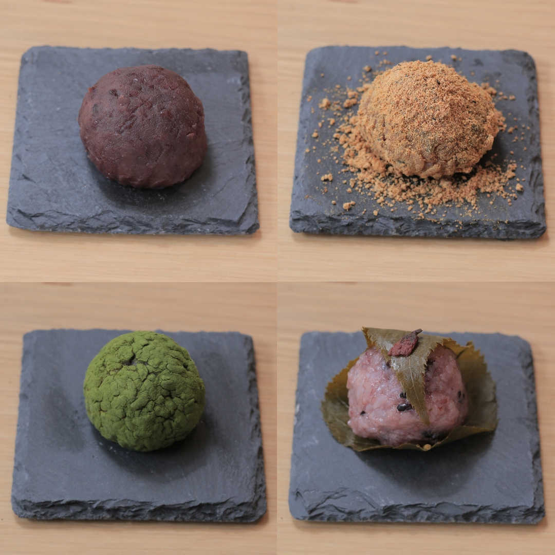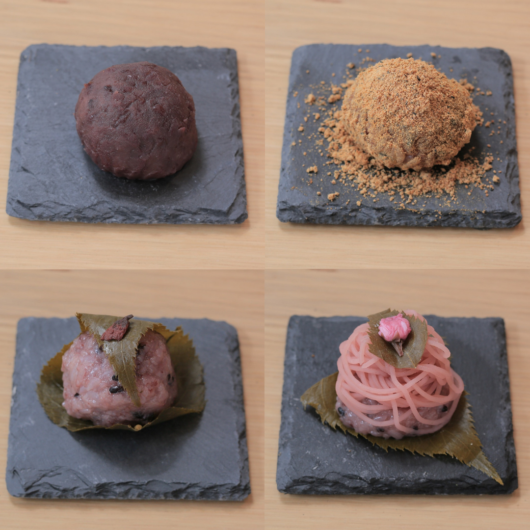 〈粒あんおはぎ・丹波黒きな粉おはぎ・桜餅・桜モンブランおはぎ〉
