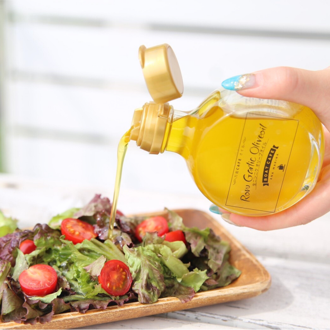 自家製にんにくと最高品質ギリシャ産エキストラバージンオリーブオイルを独自の低温製法によりじっくり抽出。クリアで深みのある味わいはドレッシングとしてもお使いいただけます。