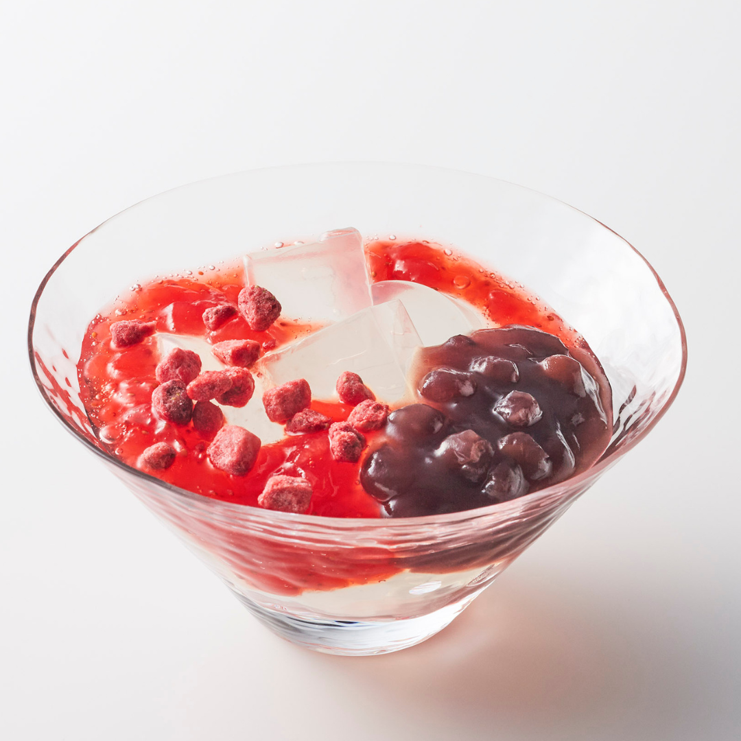 寒天に餡といちごソースを合わせてお召し上がりいただくあんみつです。