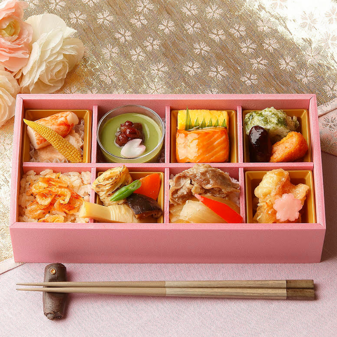 桜海老コロッケや御飯、鮭柚香焼、牛すき焼や煮物、甘味などおもてなしやご挨拶におすすめのお弁当。