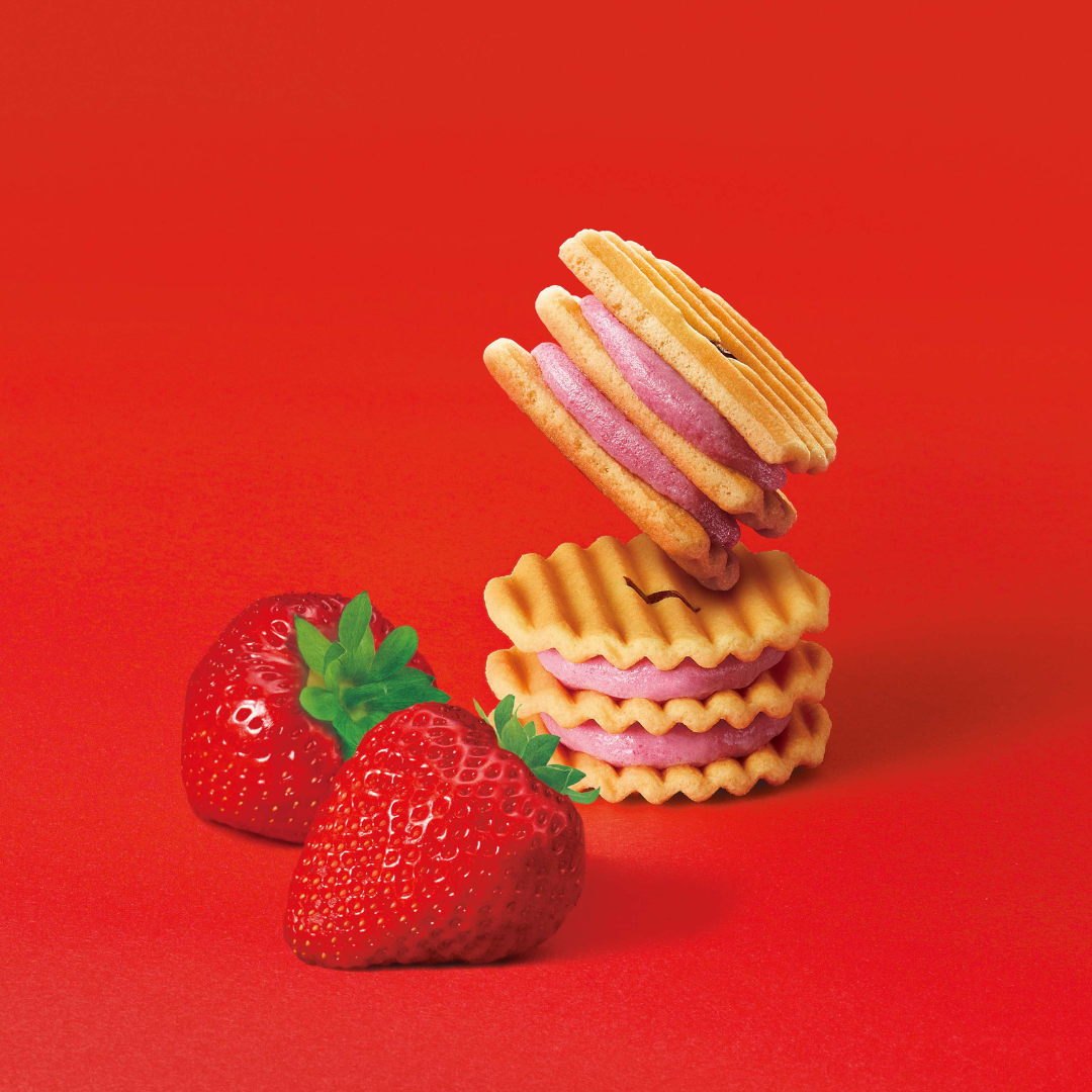 あまおう苺クリームの甘酸っぱさを味わえる、2段重ねの姫千寿せんべい。