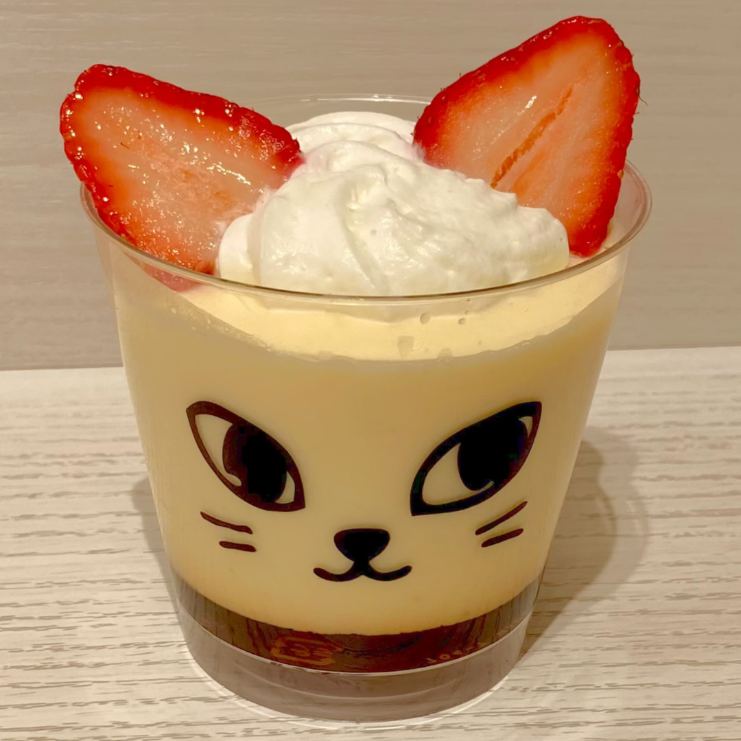 カスタードプリンを、かわいいネコのカップに。苺でネコの耳を表現してみました。
