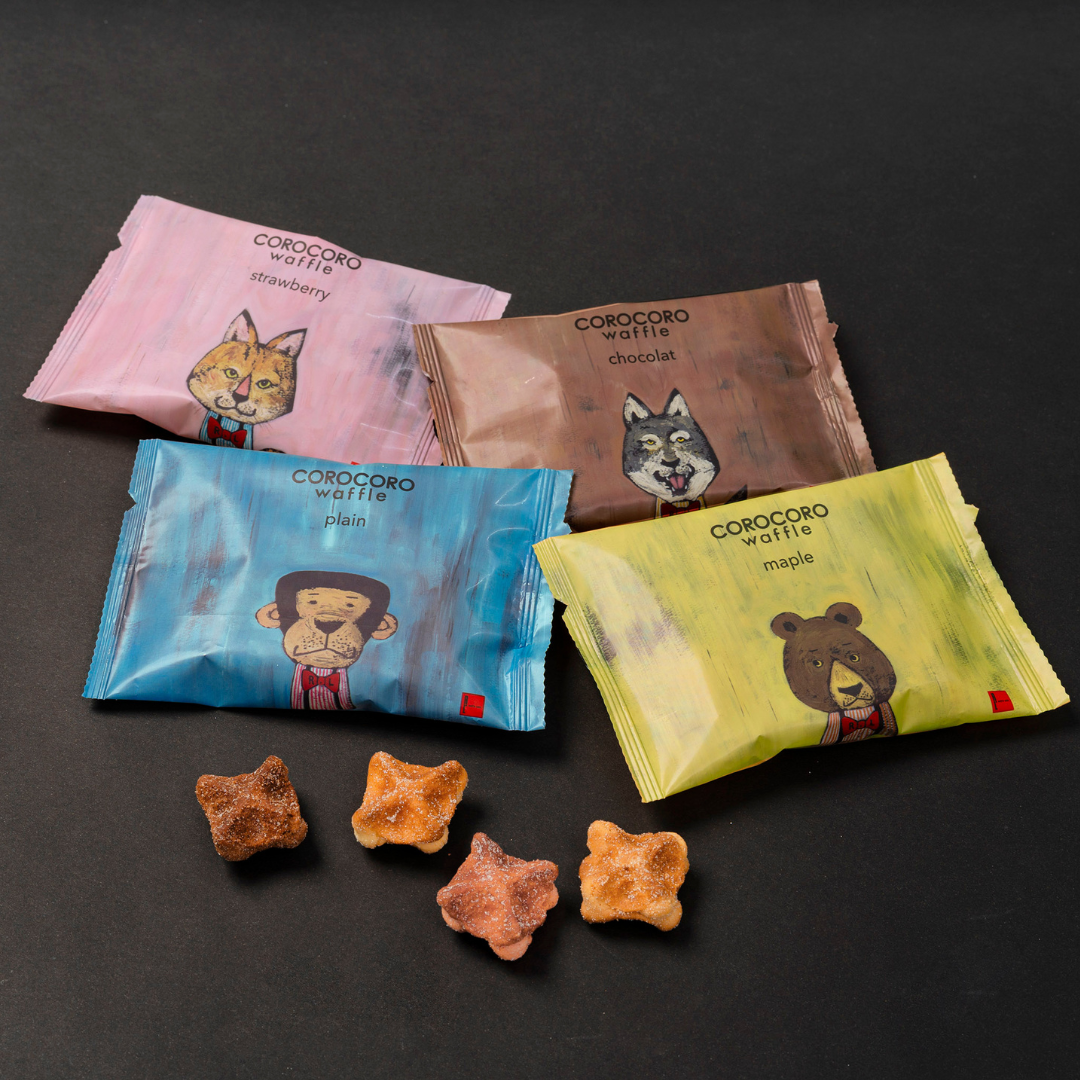 絵本作家谷口智則氏によるデザインパッケージが楽しいコロコロワッフル。食べきりパック5種入りセットを特別価格で。