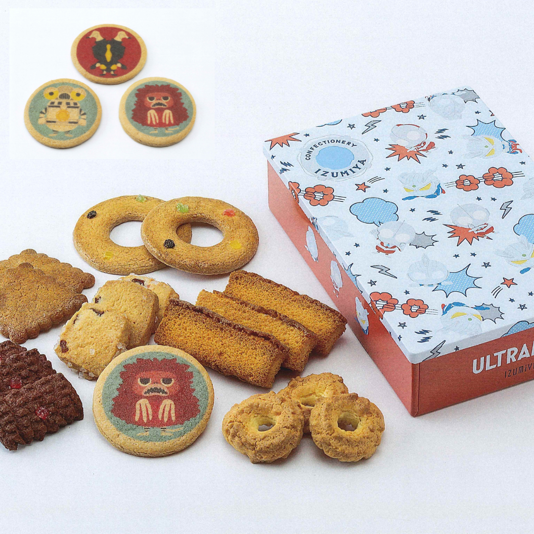 ウルトラマンシリーズ60周年と昭和2年創業泉屋東京店がコラボ。ウルトラマン、ウルトラマンゼロ、ウルトラマンゼットが描かれたデザイン缶。プリントクッキーが全3種類の中からランダムで1枚入っています。