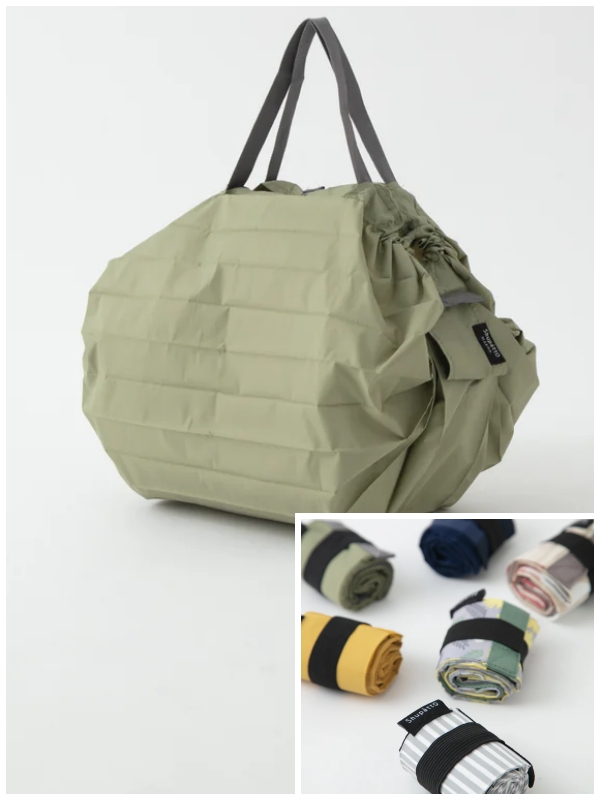 荷物が増えた時に持っていて便利なシュパットのエコバッグ。使い終わったら袋口の両端を横に引いてシッバッと一気にたためます。
