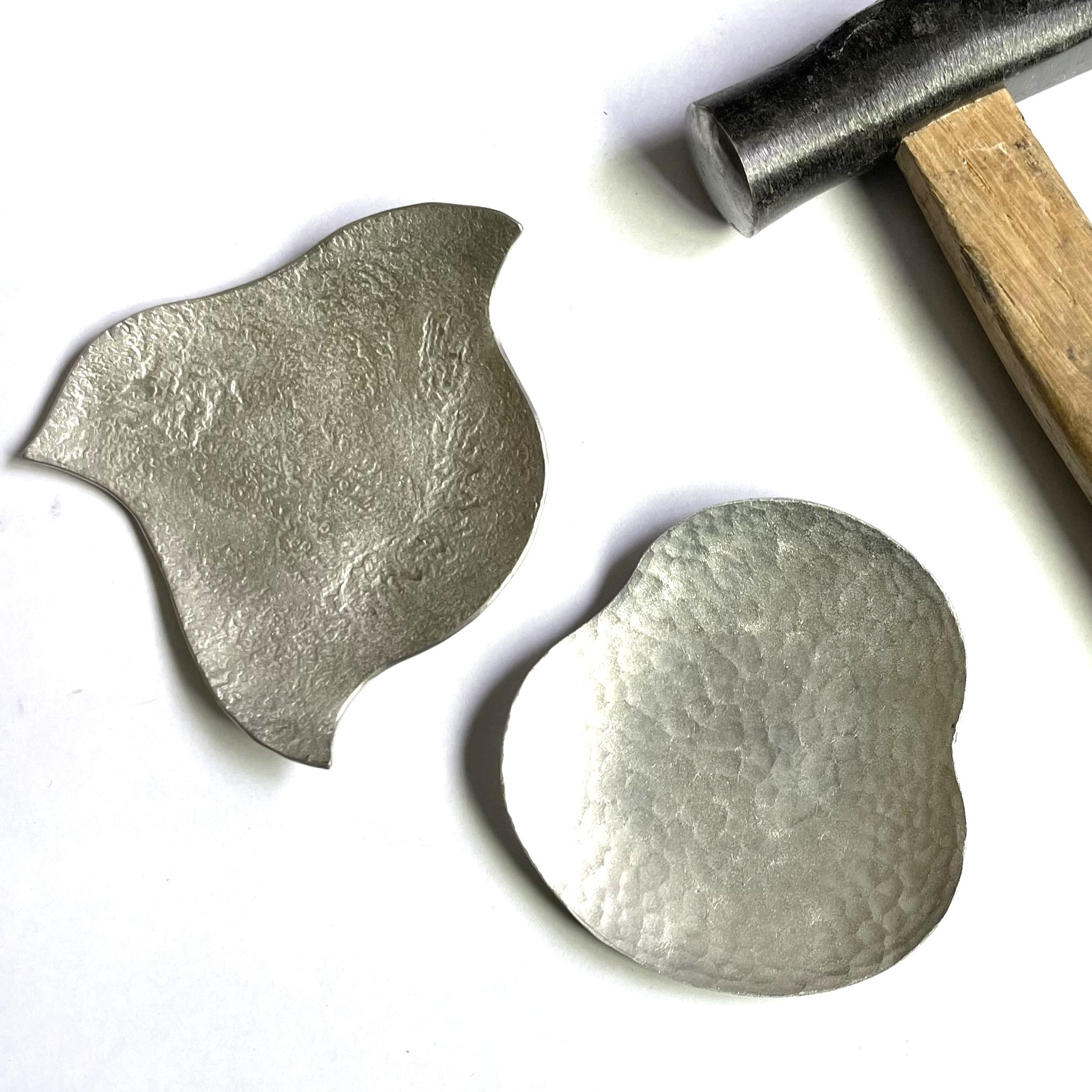 錫(スズ)の板から金槌で模様を打ち、木の道具を使って成形し、小皿やアクセサリーを作る体験。
